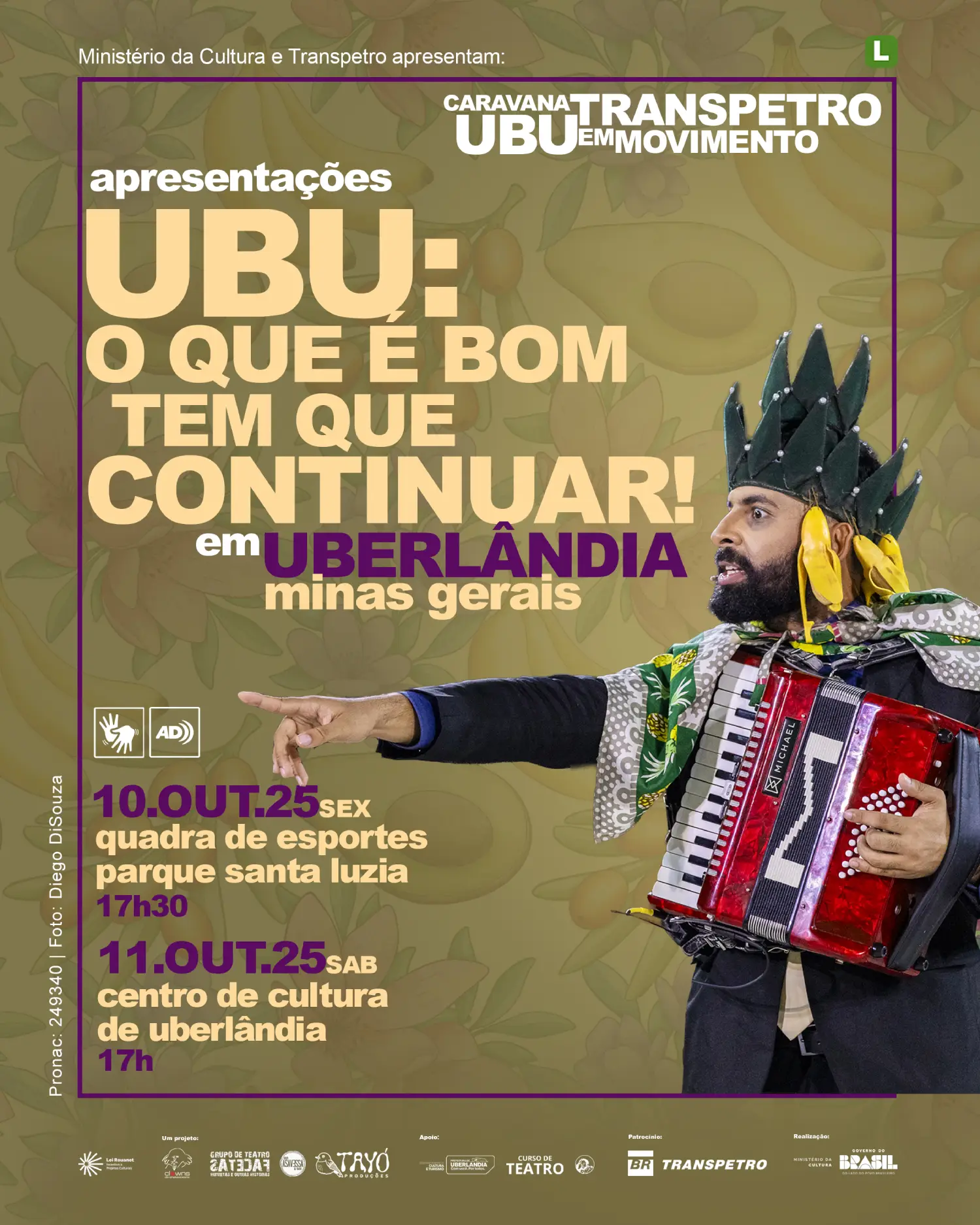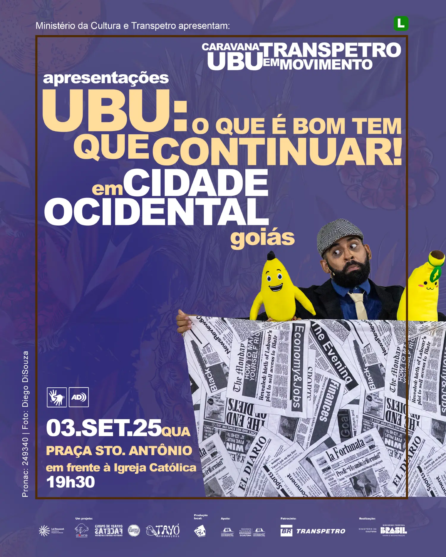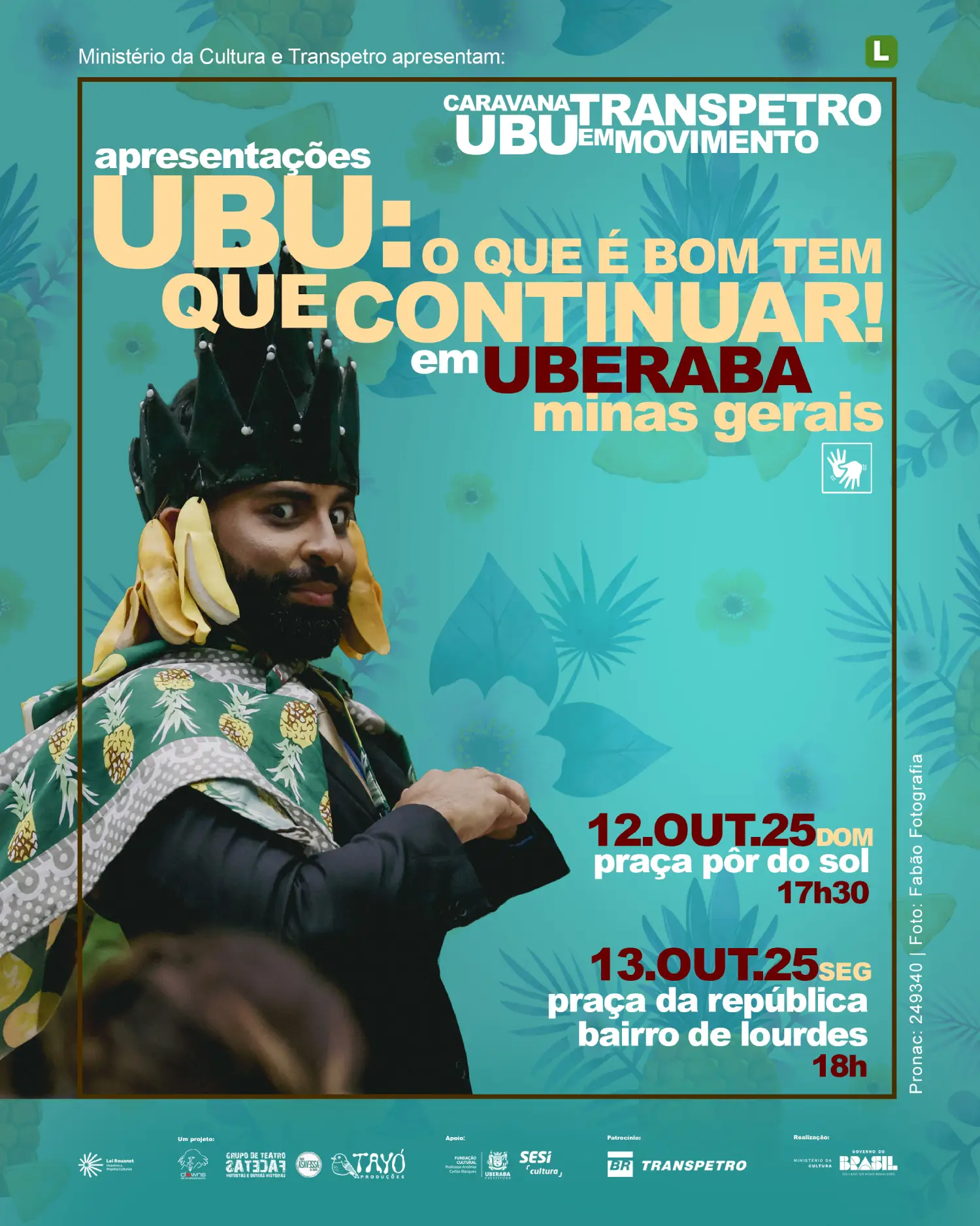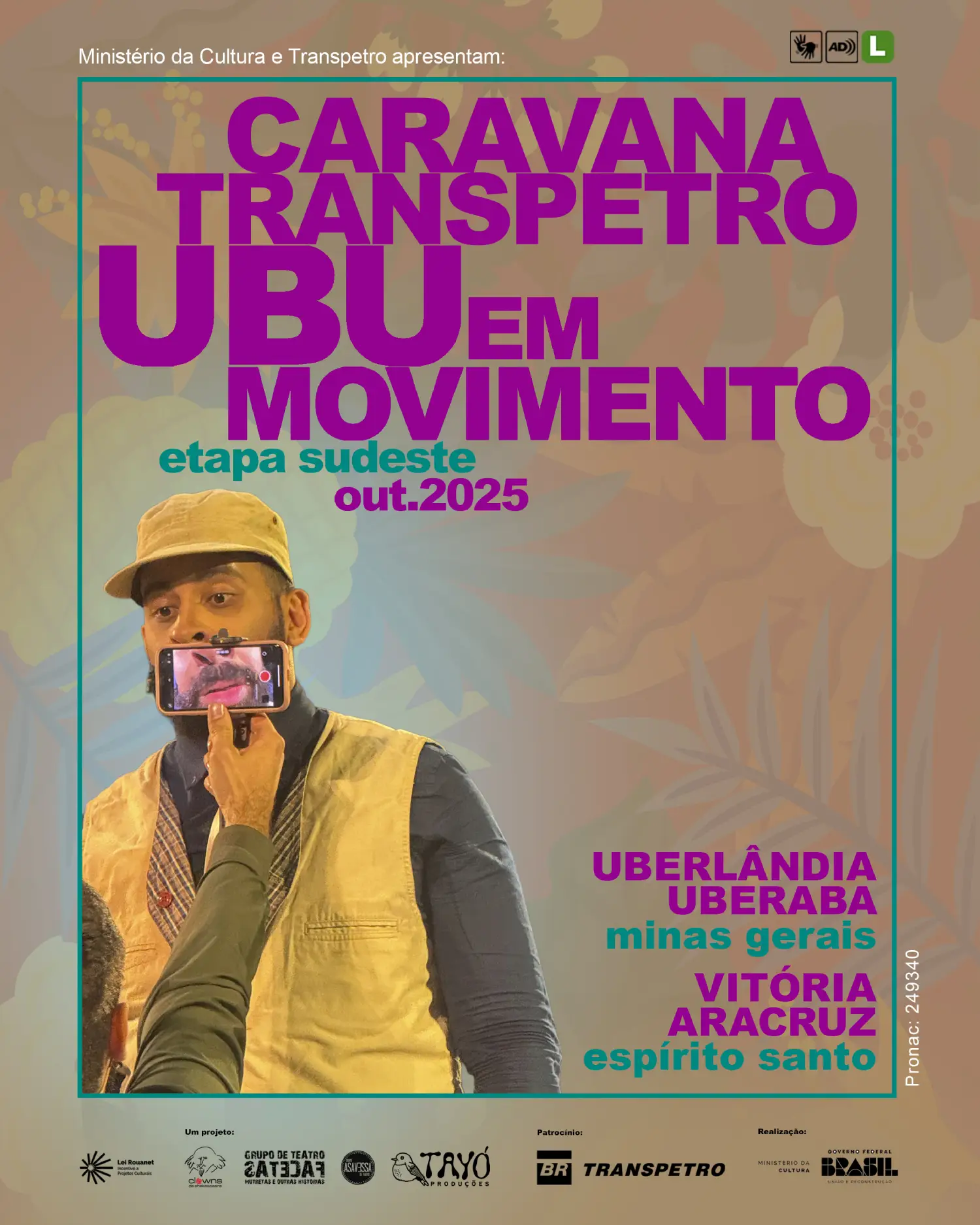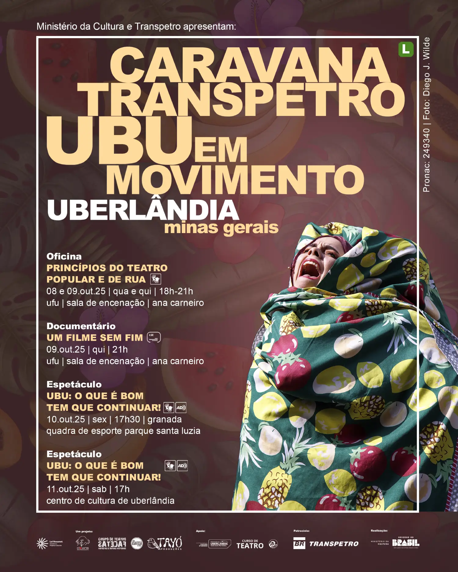 De julho a outubro de 2025 levaremos a obra “Ubu: o que é bom tem que continuar!” por três regiões brasileiras: Norte, Centro-oeste e Sudeste. E além das apresentações, também serão realizadas oficinas e exibições do documentário “Um Filme sem Fim”.